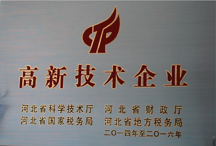 2014年9月19日,公司被河北省科學(xué)技術(shù)廳、河北省財(cái)政廳、河北省國家稅務(wù)局、河北省地方稅務(wù)局認(rèn)定為河北省高新技術(shù)企業(yè),證書編號(hào):GR201413000387,近日頒發(fā)了證書和牌匾。